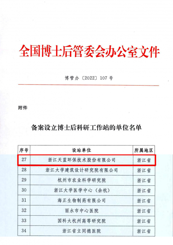 浙江天藍(lán)環(huán)保技術(shù)股份有限公司獲批國(guó)家級(jí)博士后工作站,標(biāo)志著天藍(lán)環(huán)保在人才隊(duì)伍、技術(shù)創(chuàng)新和科研平臺(tái)建設(shè)上的重大突破。