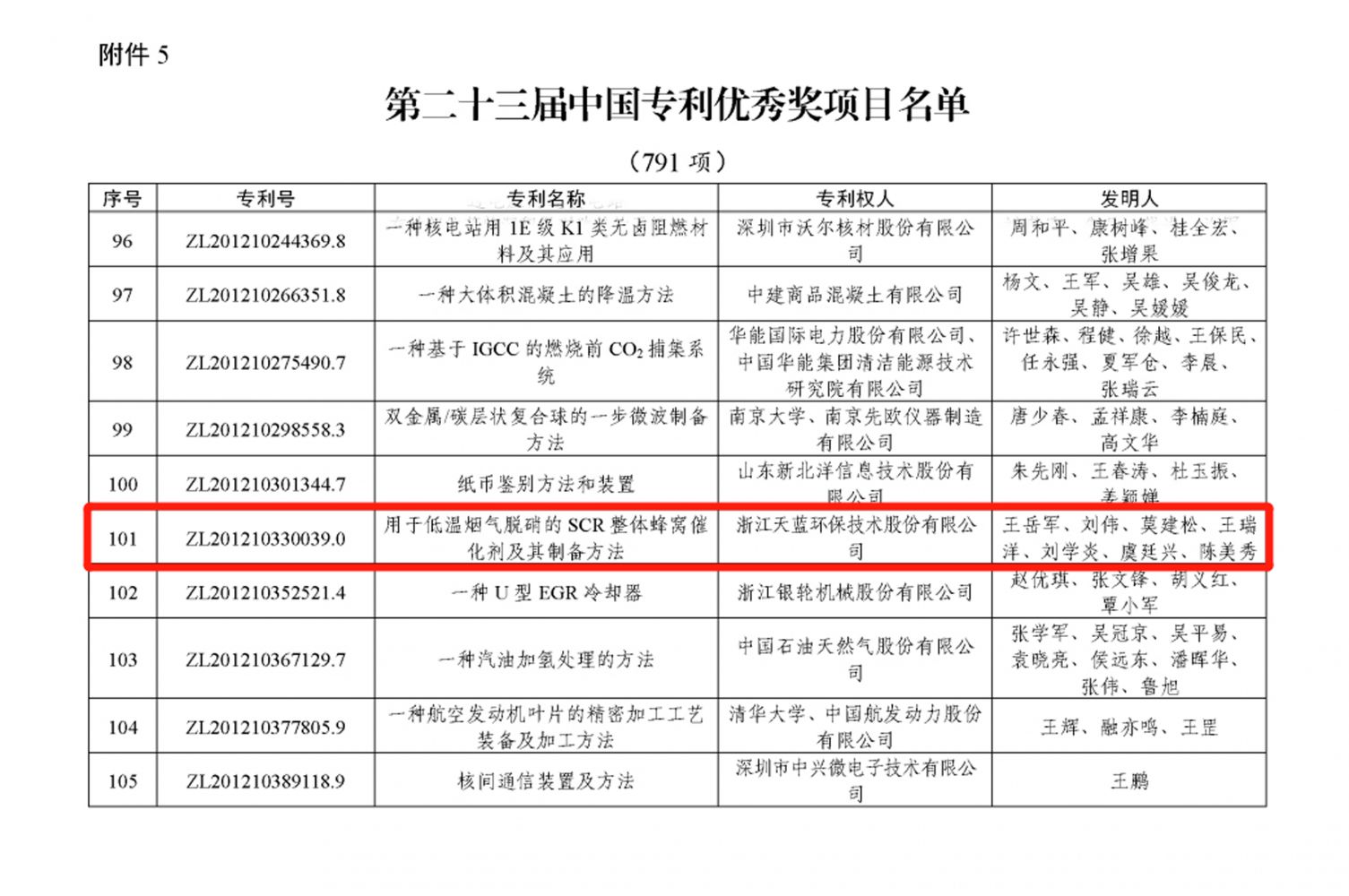 在剛剛揭曉的第二十三屆中國(guó)專利獎(jiǎng)中,我司發(fā)明專利“用于低溫?zé)煔饷撓醯腟CR整體蜂窩催化劑及其制備方法”榮獲中國(guó)專利獎(jiǎng)優(yōu)秀獎(jiǎng)。
